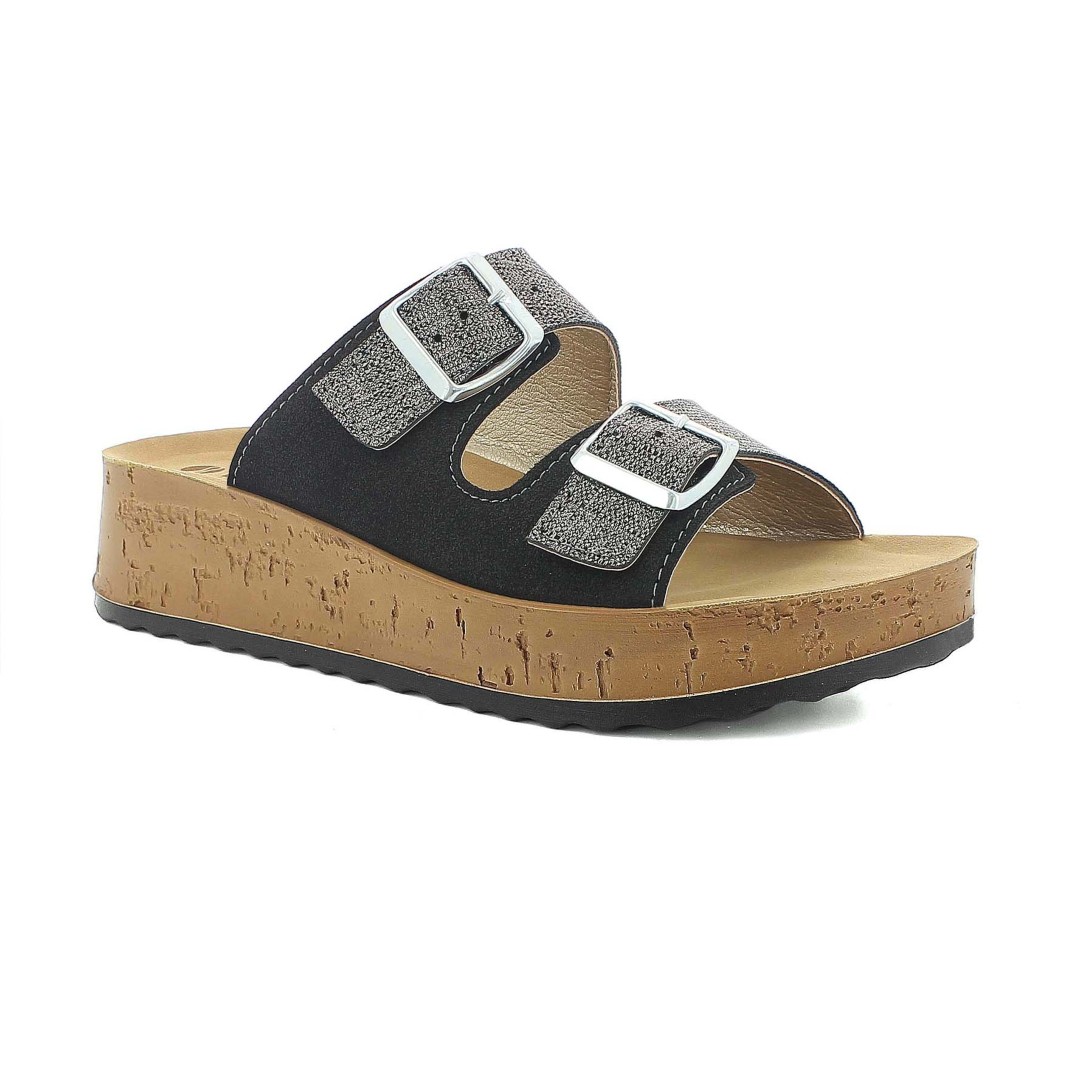 Queste inblu hanno due fibbie regolabili che garantiscono un indosso personalizzato.Il plantare in morbida ecopelle imbottita accoglie il piede con una sensazione soffice. La suola ultra leggera con rialzo da 4,5 centimetri rende la camminata comoda.