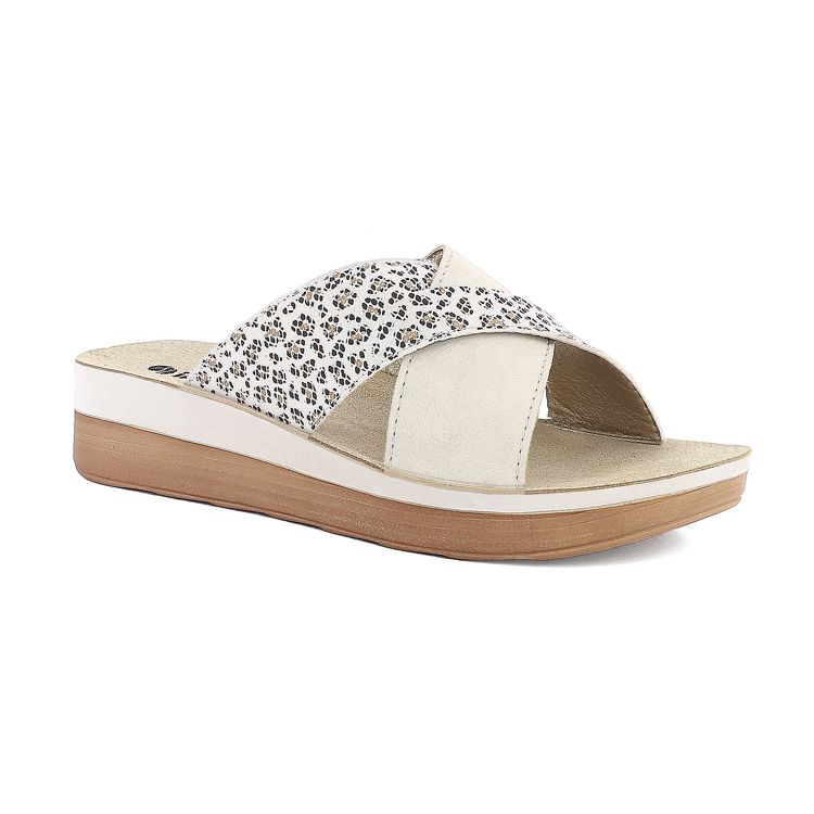Ciabatte a zeppa con doppia fascia unita da pietre colorate. Morbido plantare in vera pelle.