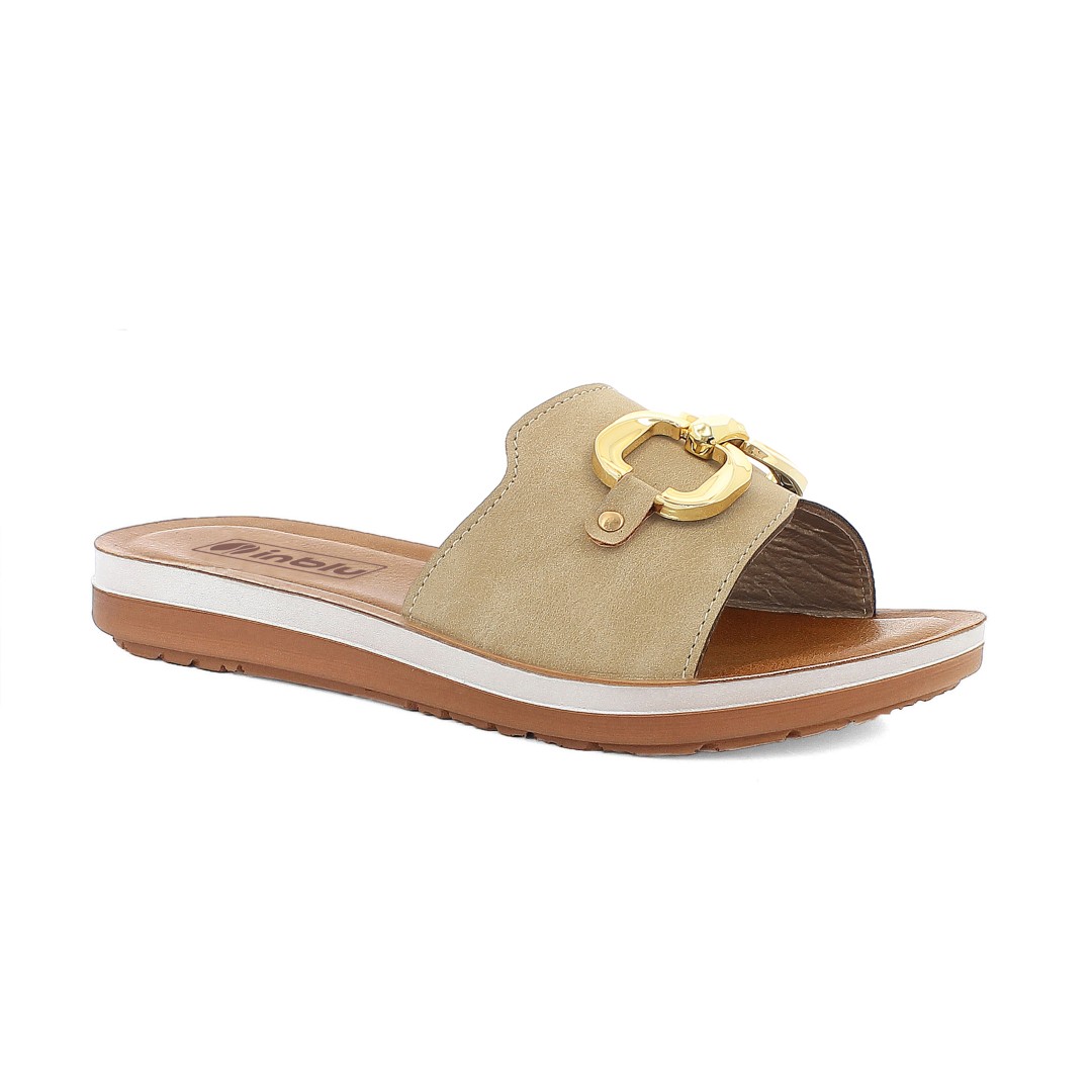 Ciabatte con tomaia decorata da un elegante morsetto dorato, plantare in ecopelle imbottita e suola leggera bicolore.