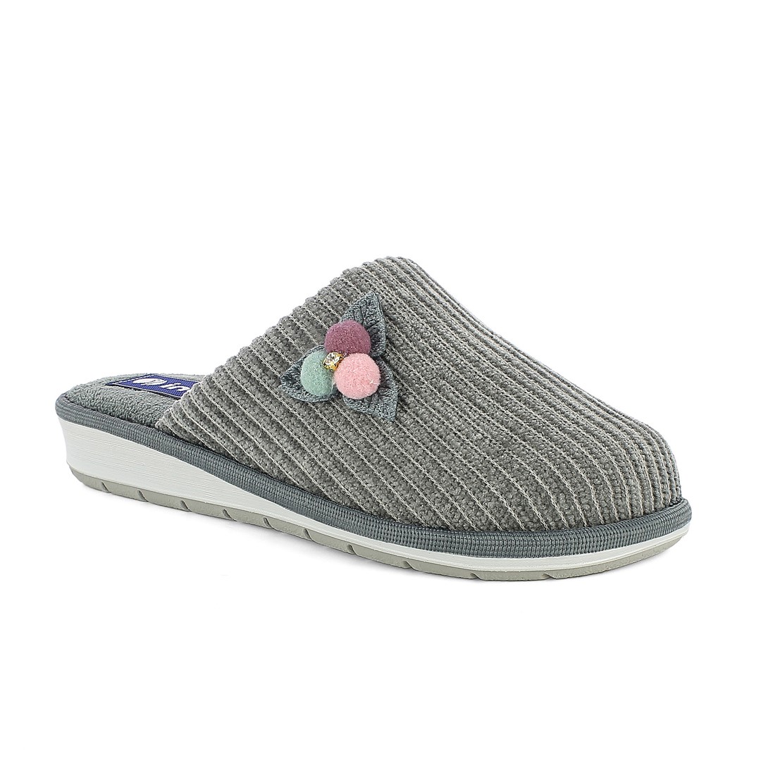 Pantofole a costine con originale applicazione ad aghifoglio colorato impreziosito da un brillantino. Hanno un morbido plantare imbottito.La suola, leggera e resistente, ha un tacco di tre centimetri.