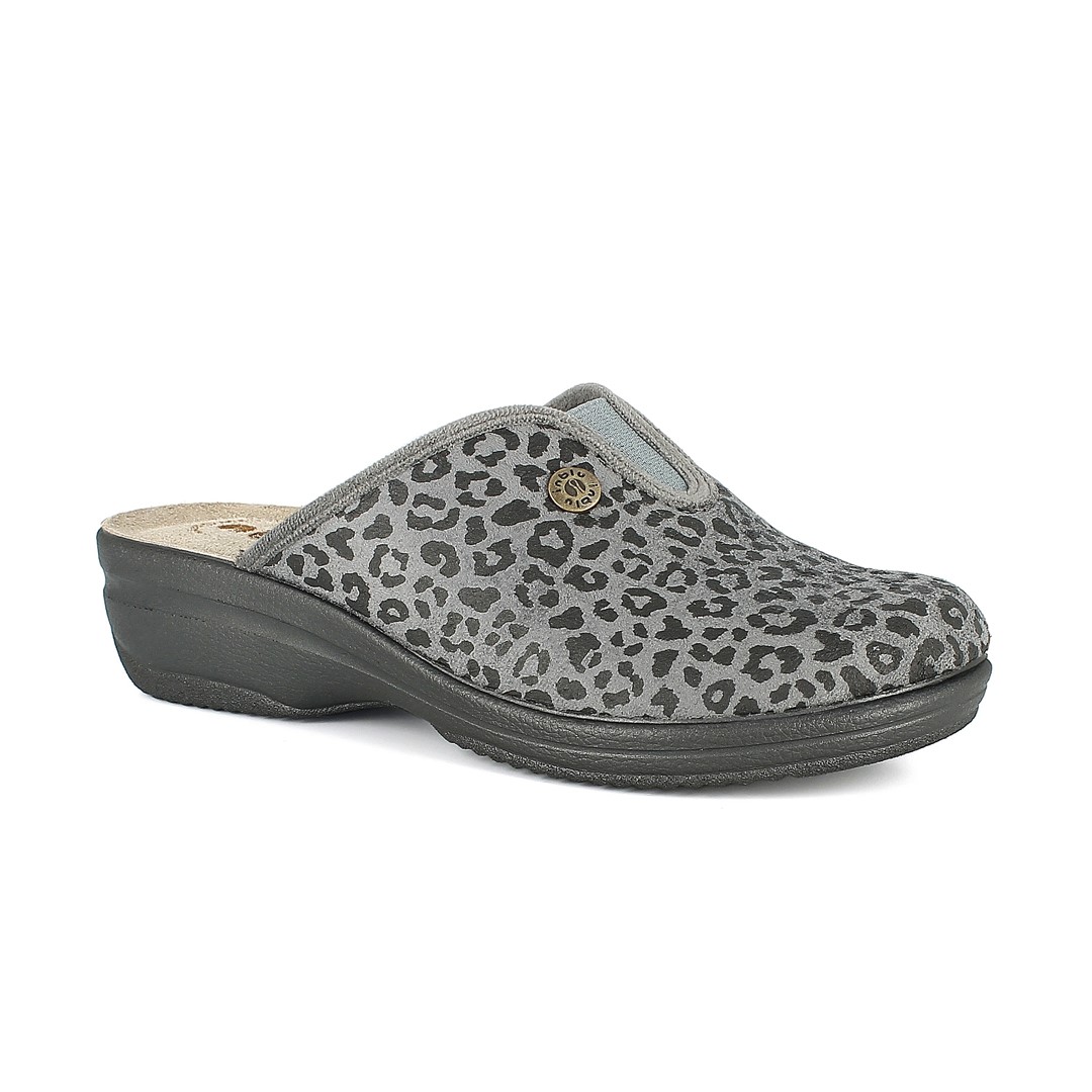 Pantofole con particolare decoro astratto e prafica fibbia. Ha un plantare anatomico in ecopelle.