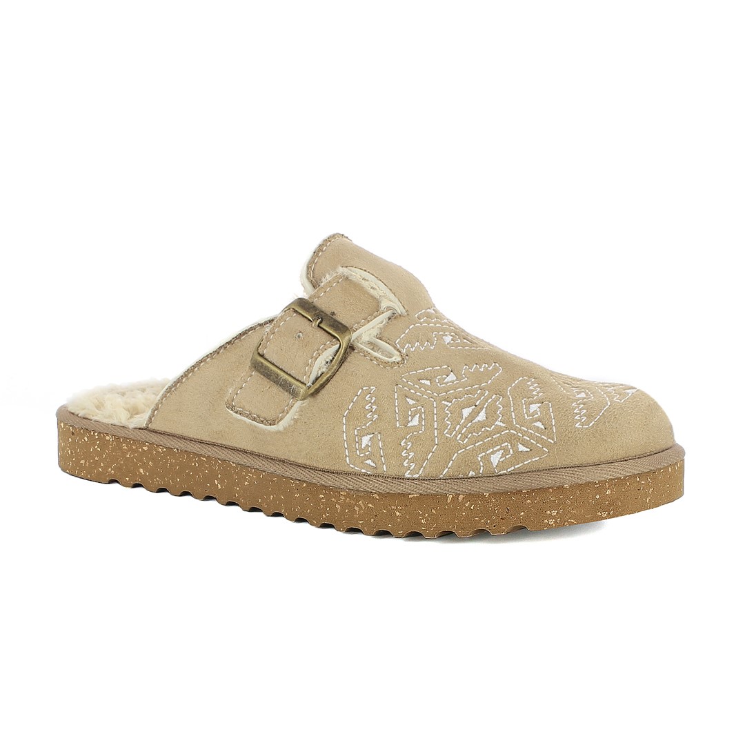 Pantofofole con ecopelliccia realizzate con originale disegno geometrico e fibbia.