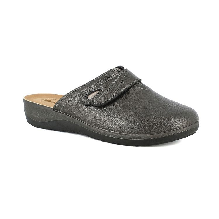 Comode ciabatte con sottopiede anatomico in pelle. Hanno una finitura in ecopelle e chiusura a strappo.