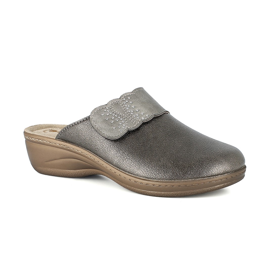 Pantofole con pratica chiusura a strappo con brillantini e plantare in vera pelle.